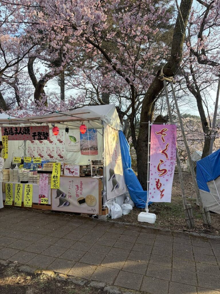 公園内の露店や、高遠の老舗和菓子店で購入できます。「高遠城址」の焼き印が入ったまんじゅうは定番のお土産。焼きたてさくら餅など季節限定品は午前中には完売になることが多いので、早めに立ち寄るのがおすすめです。